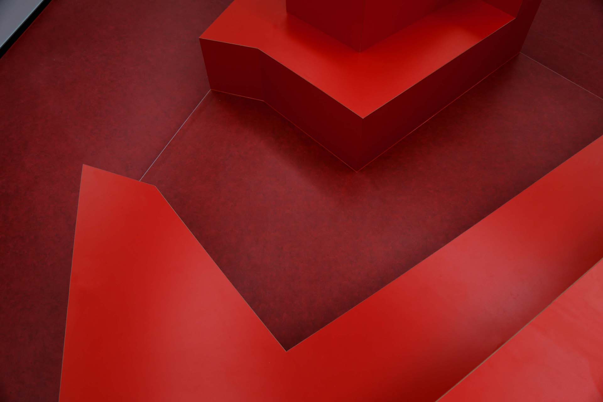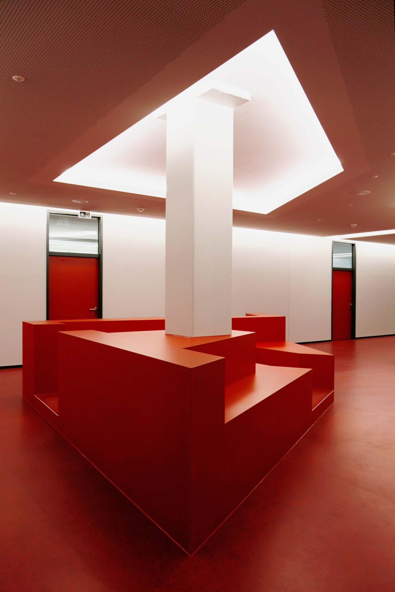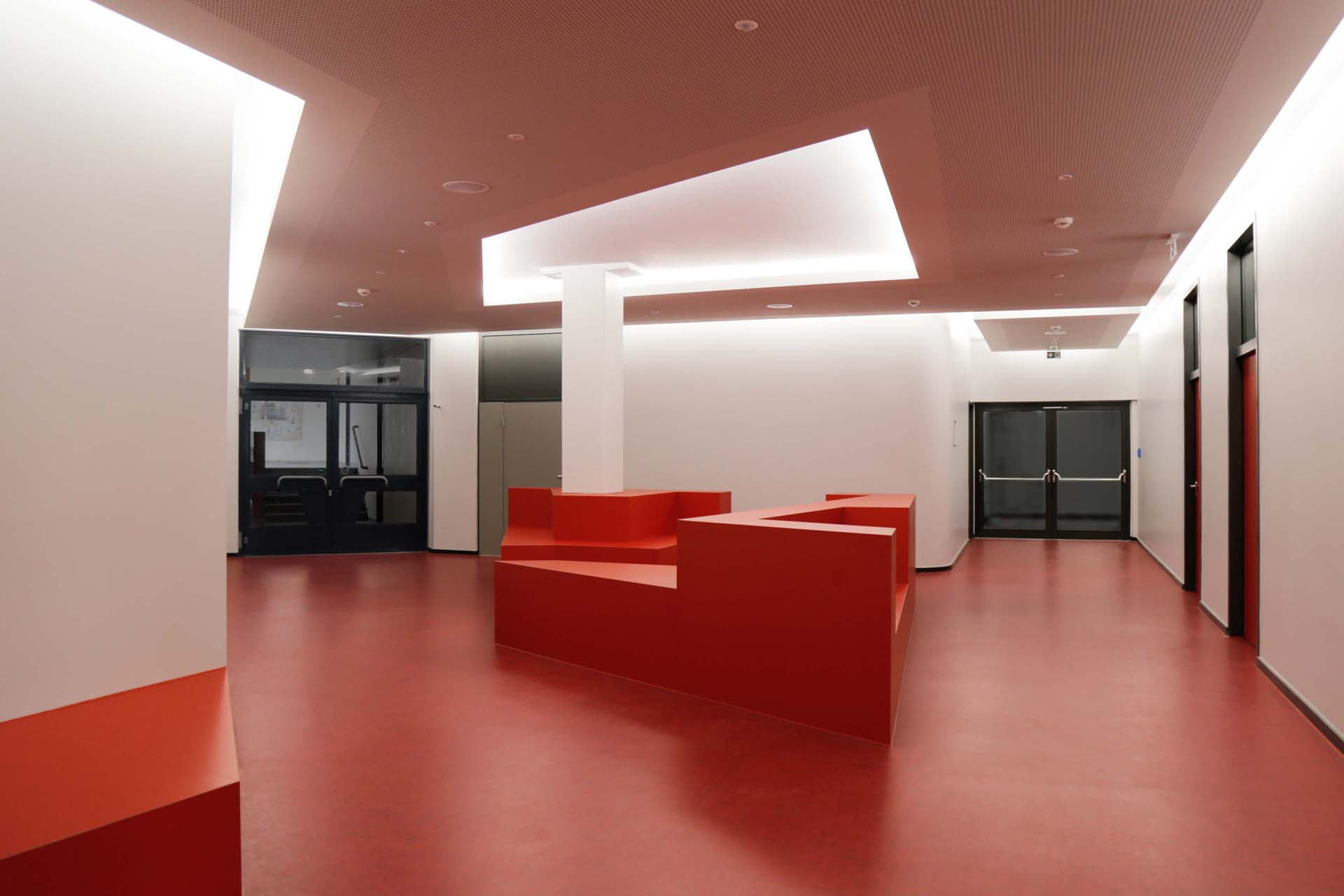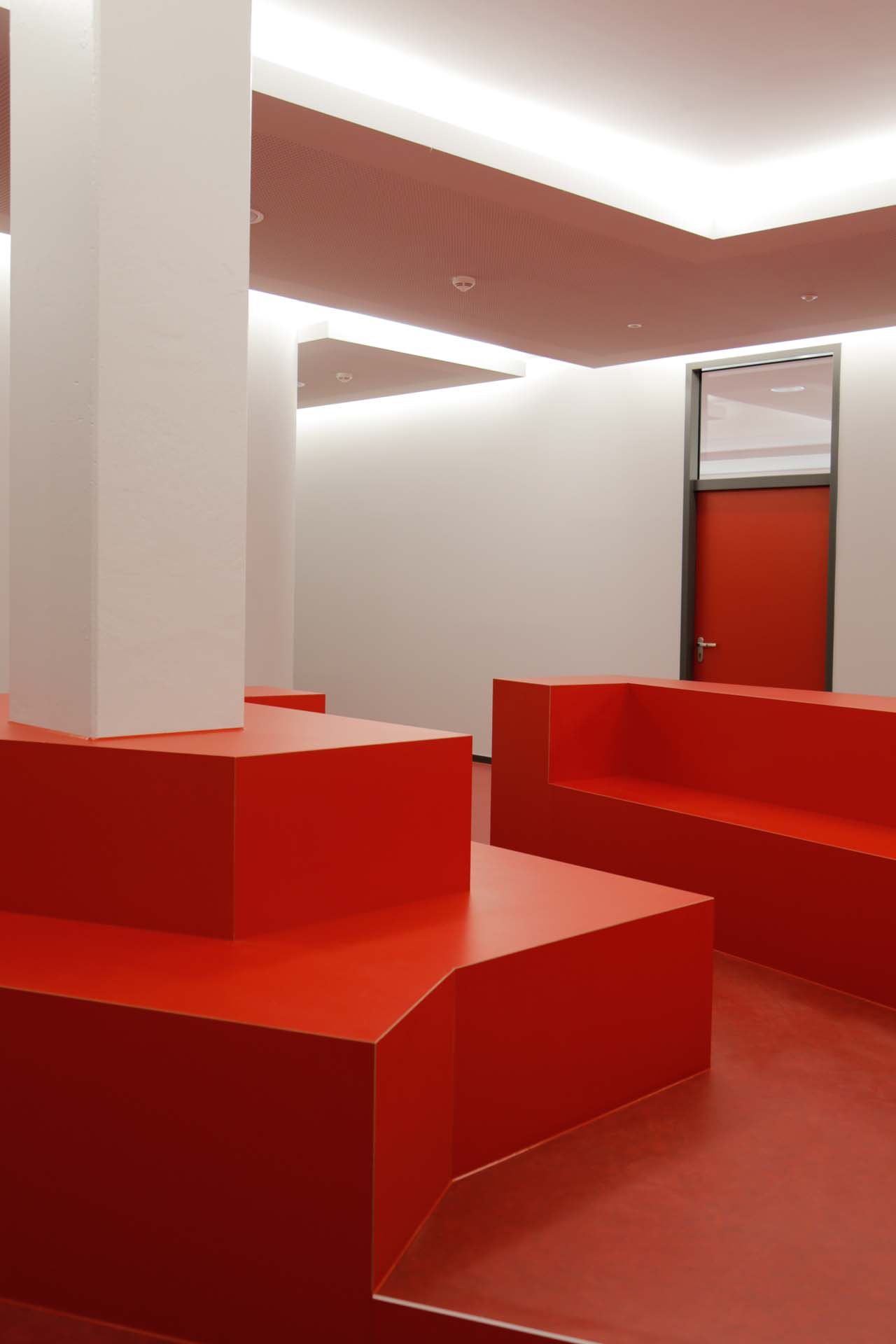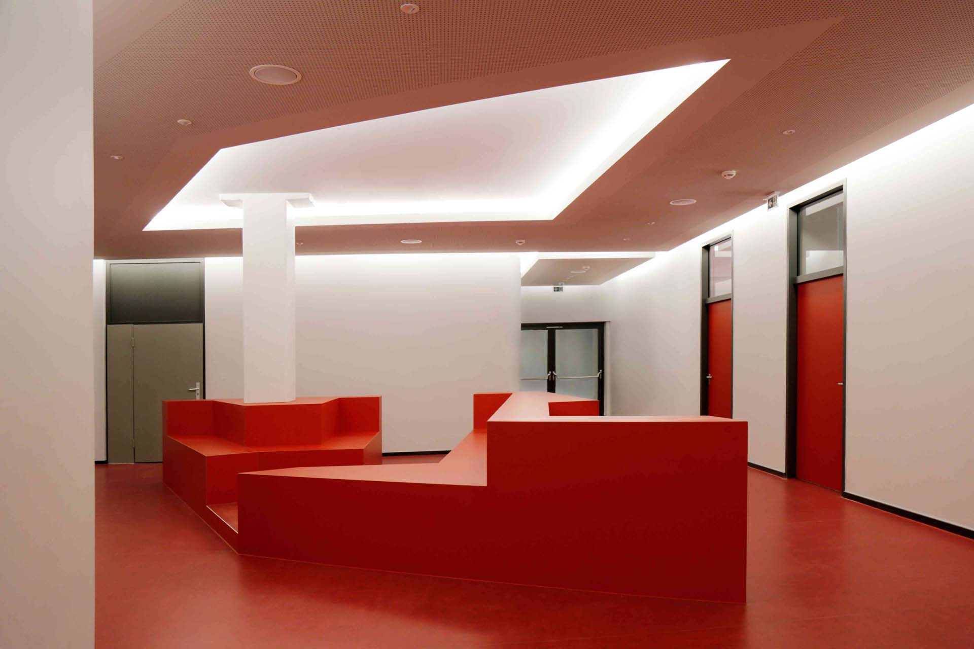 In den Schulfluren des Beethoven-Gymnasiums trifft Expressionismus auf Pop-Art mit maßgeschneiderten, ergonomisch geformten Sitzmöbeln aus polygonalen Flächen. Auffallend ist die knallrote, vieleckige Konstruktion mit den skulpturalen Sofas im Erdgeschoss.
