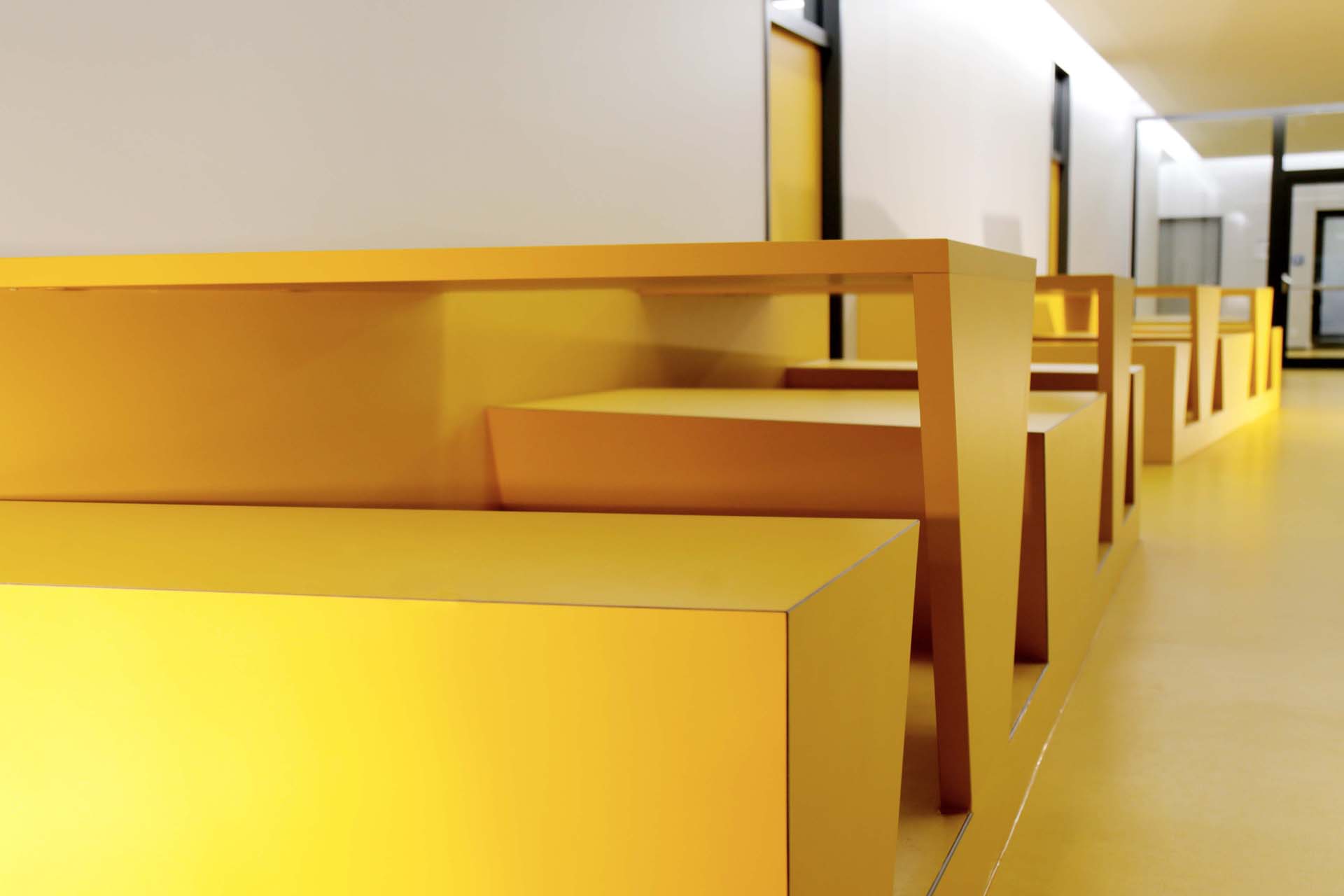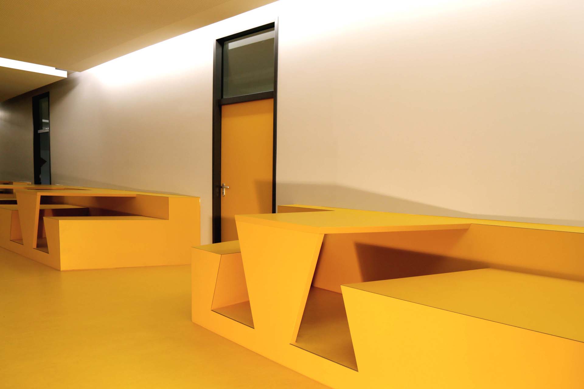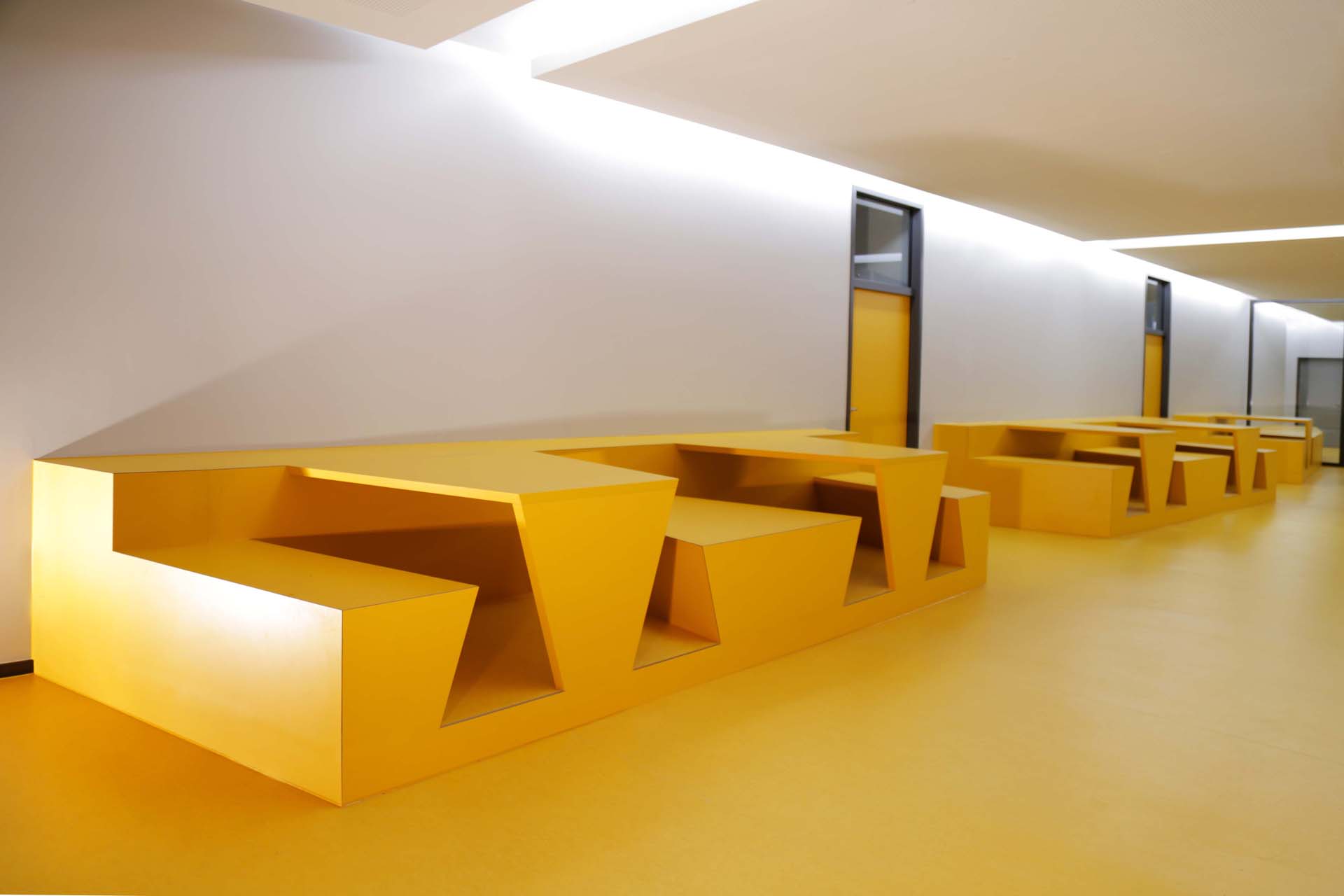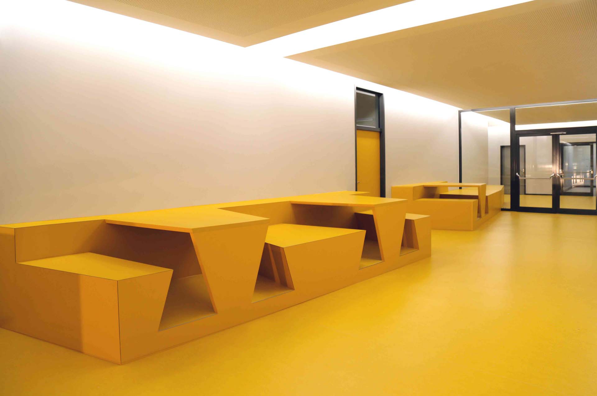 Fest eingebaute Tische und Bänke im ersten Obergeschoss aus zackigen, kantigen Formen mit windschiefen Ecken in strahlendem Sonnengelb dienen als Begegnungsstätte für die Schüler.