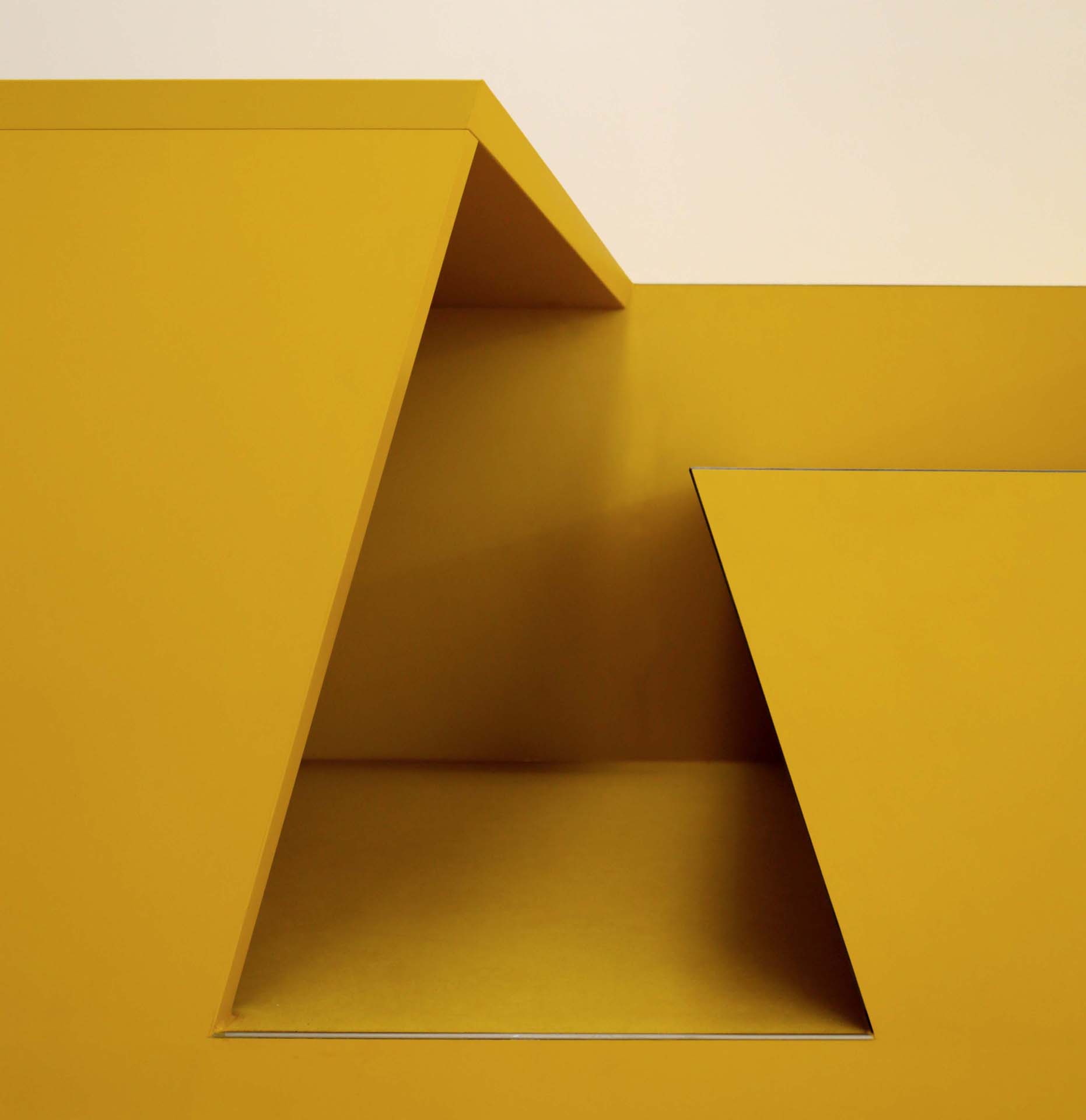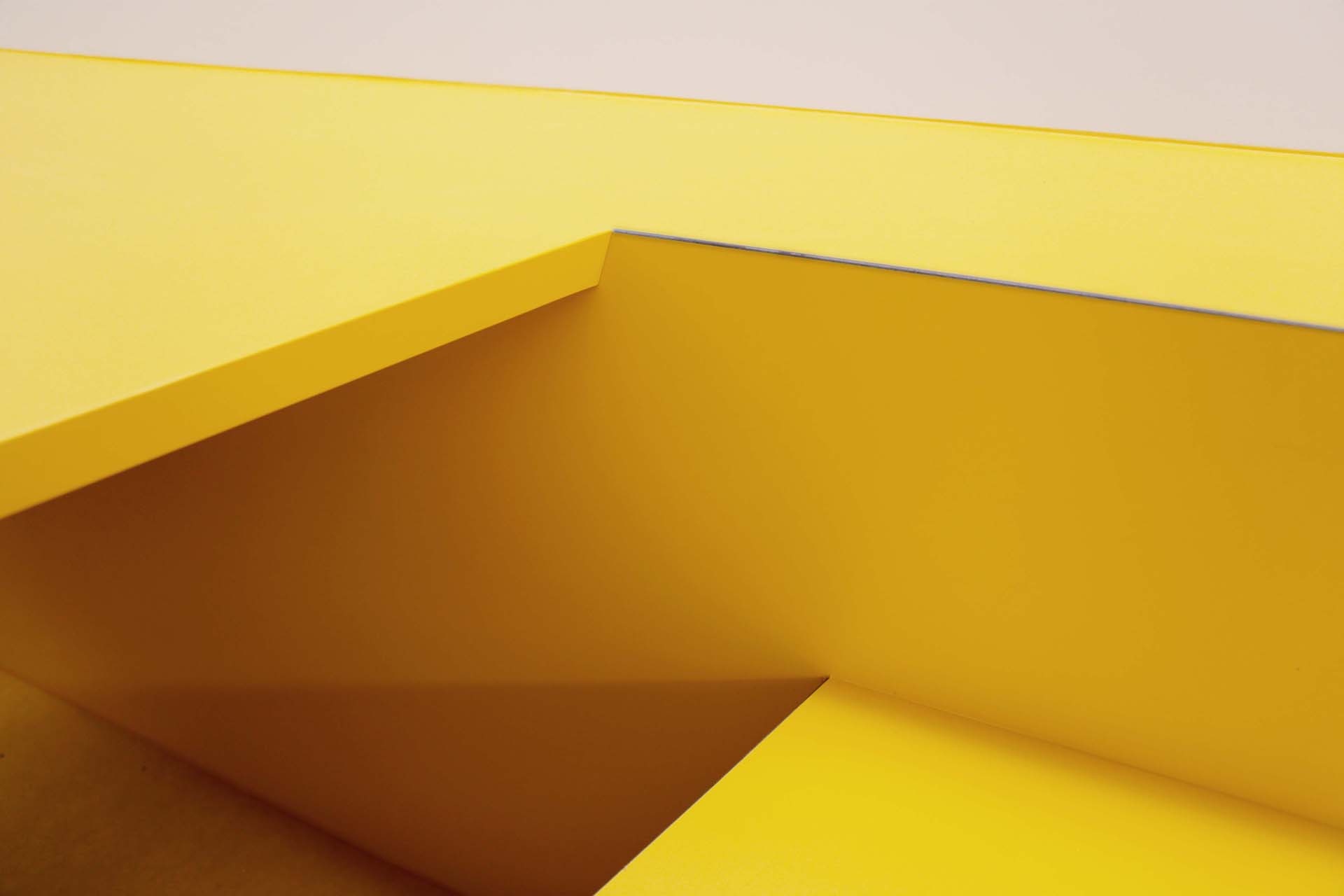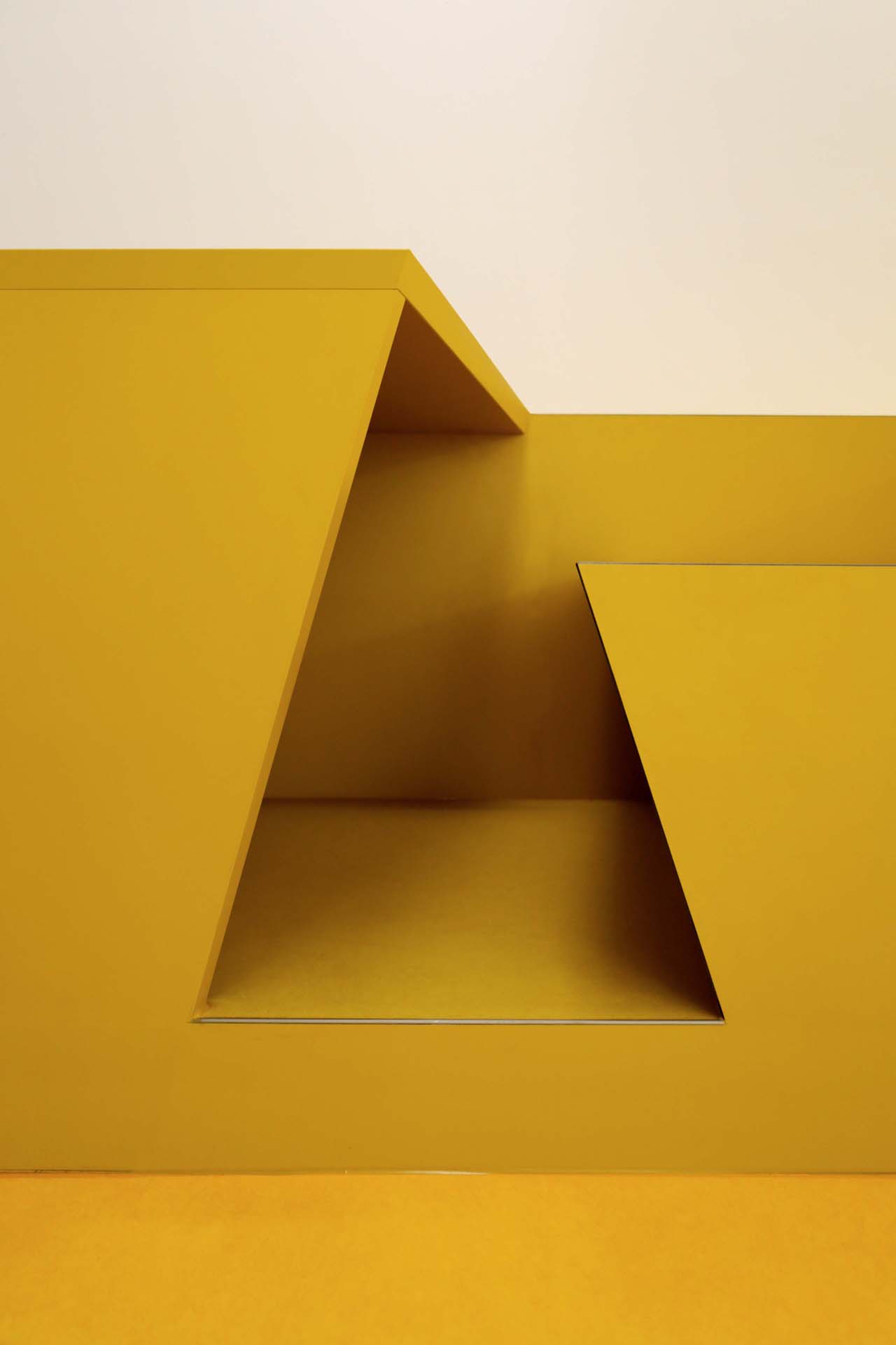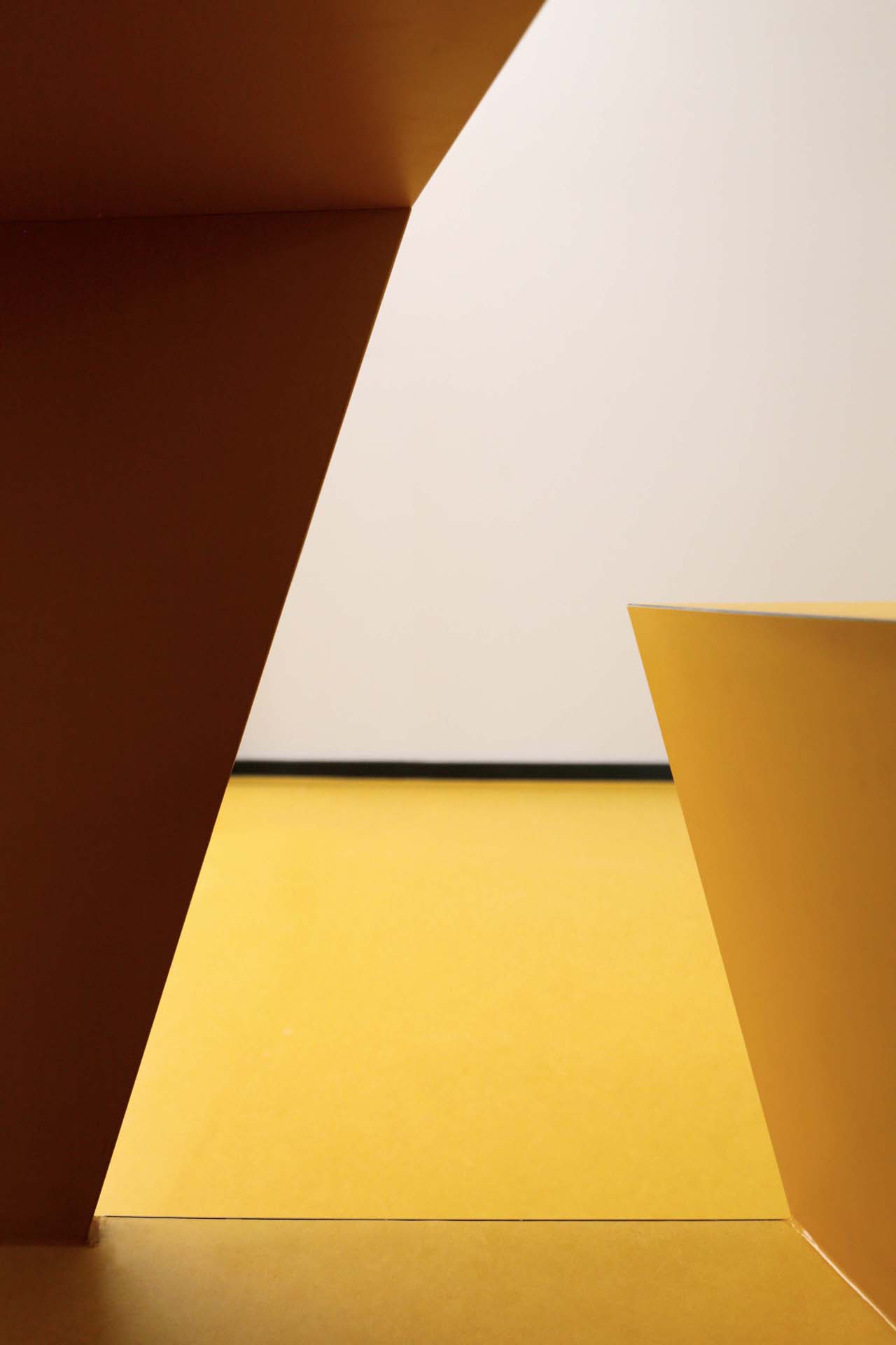 Fest eingebaute Tische und Bänke im ersten Obergeschoss aus zackigen, kantigen Formen mit windschiefen Ecken in strahlendem Sonnengelb dienen als Begegnungsstätte für die Schüler.