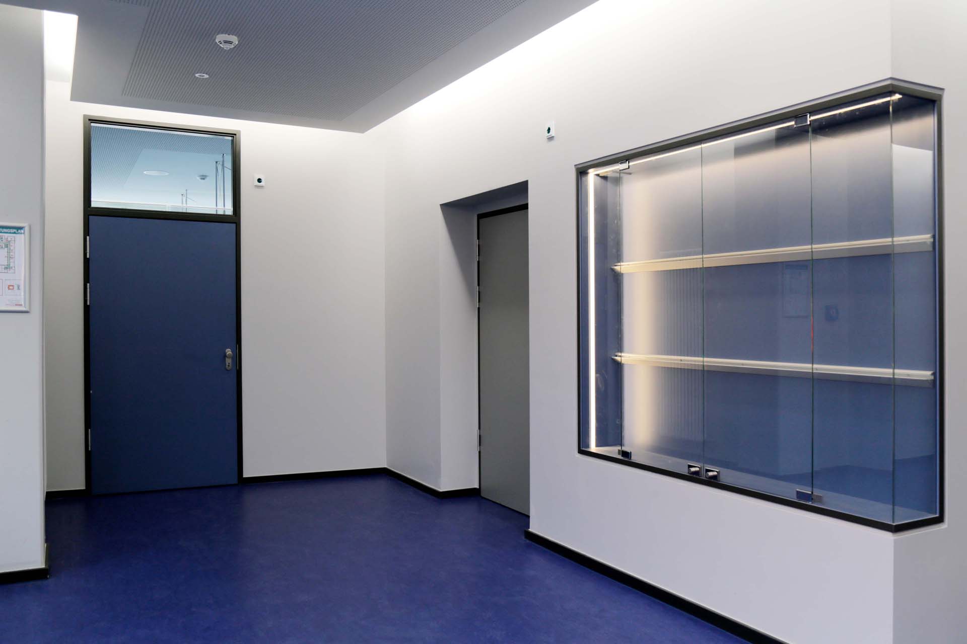 In der obersten Etage dominiert die Farbe Indigoblau. In den Wänden entlang der Flure sind gläserne Vitrinen eingebaut, die sich sehr gut als Ausstellungsflächen für ausgesuchte Exponate und Schülerprojekte eignen.