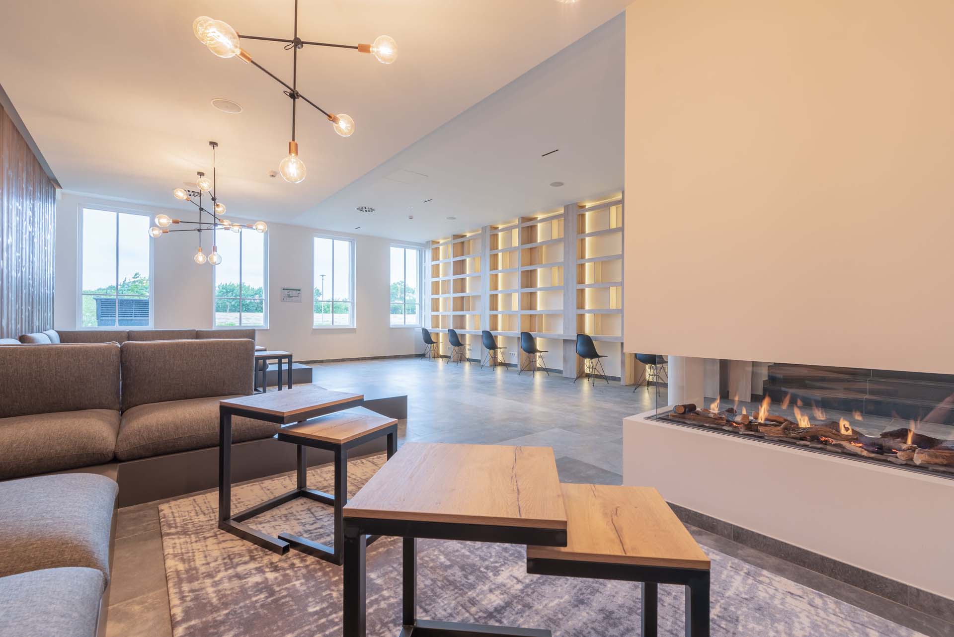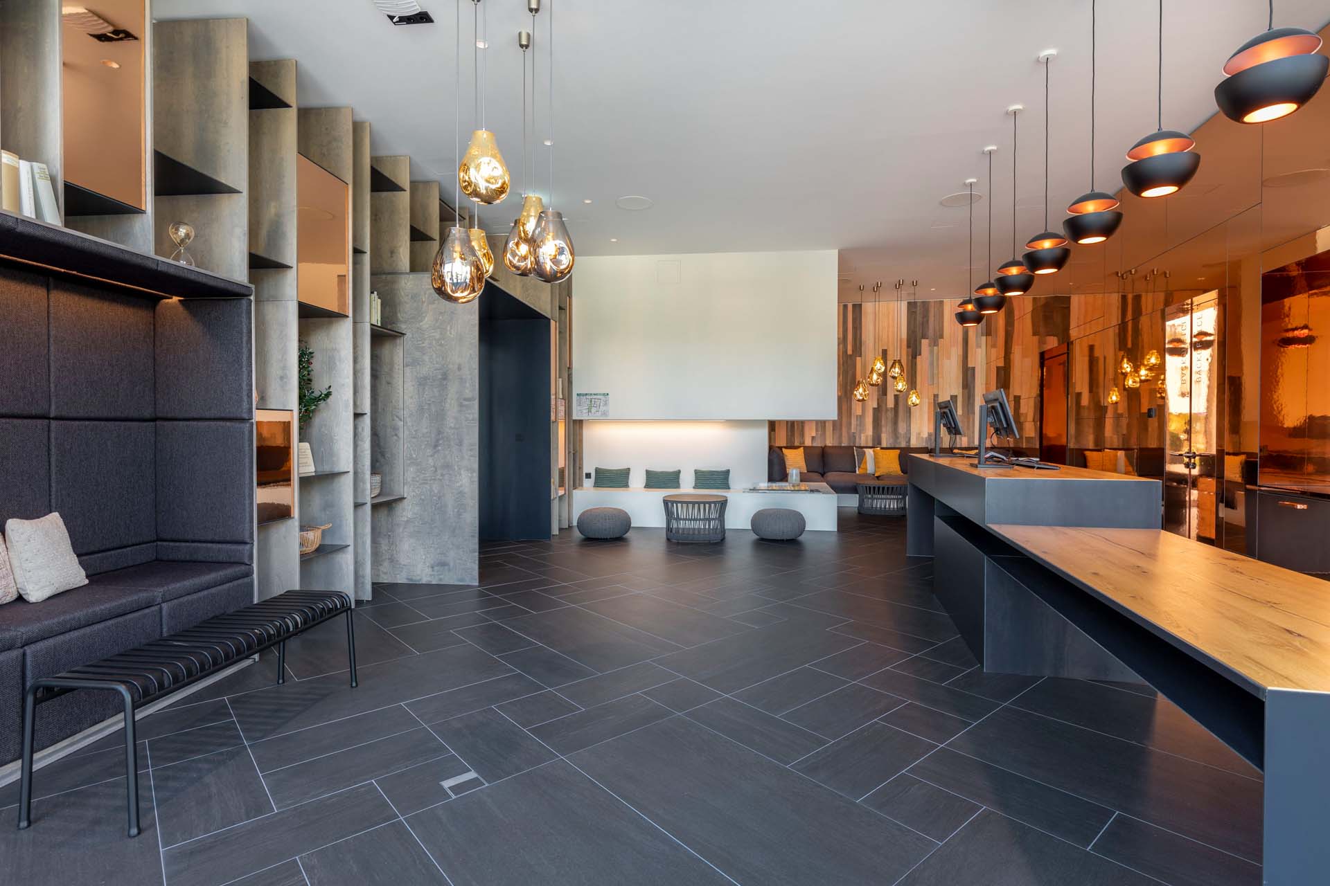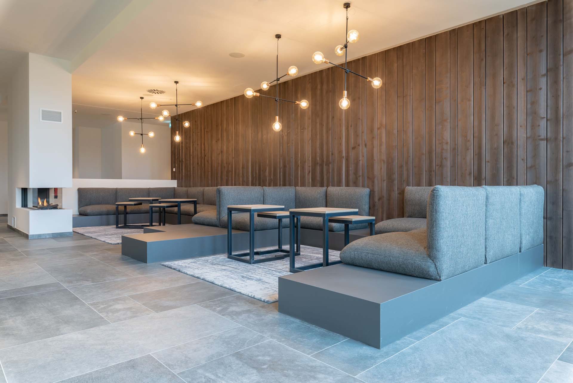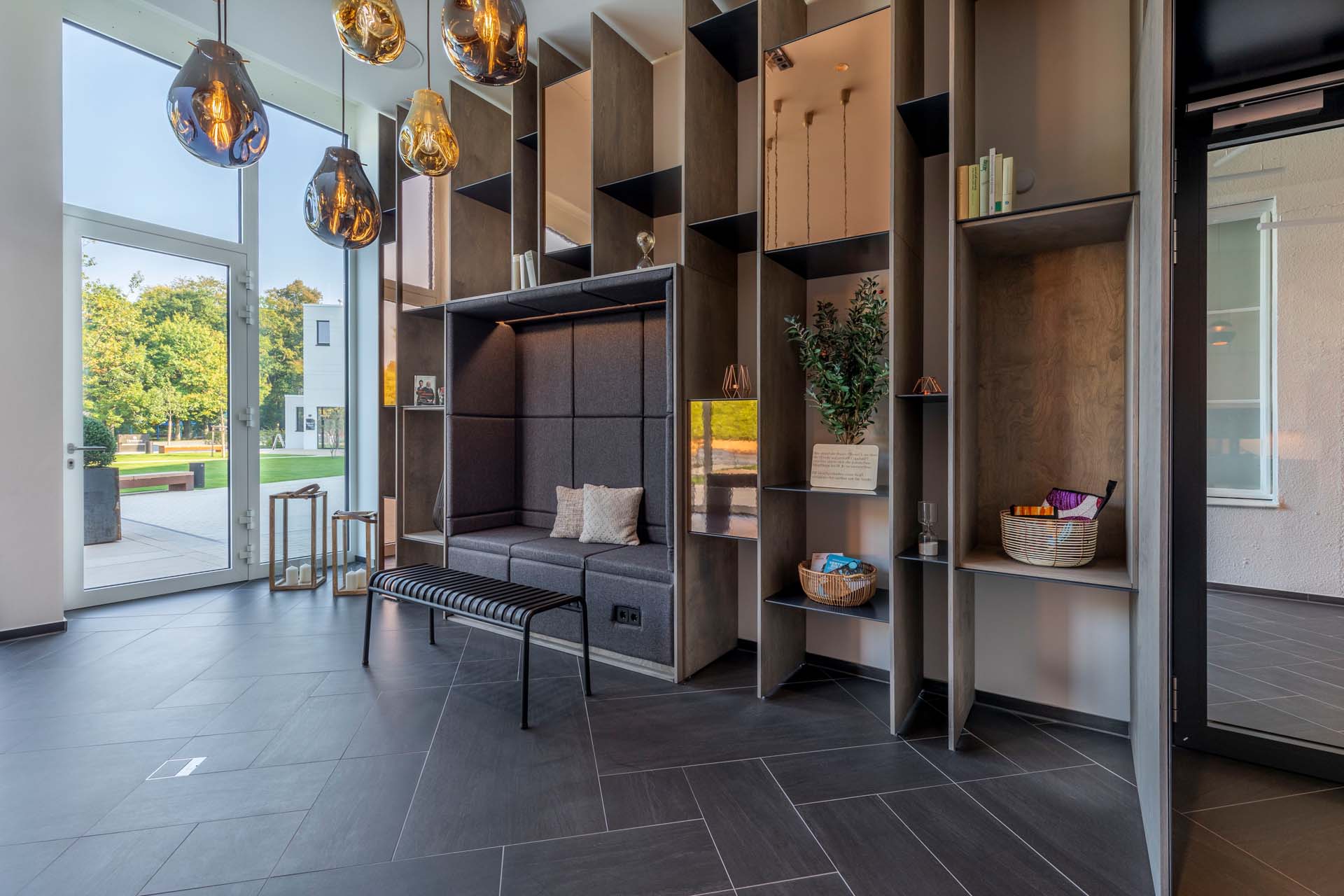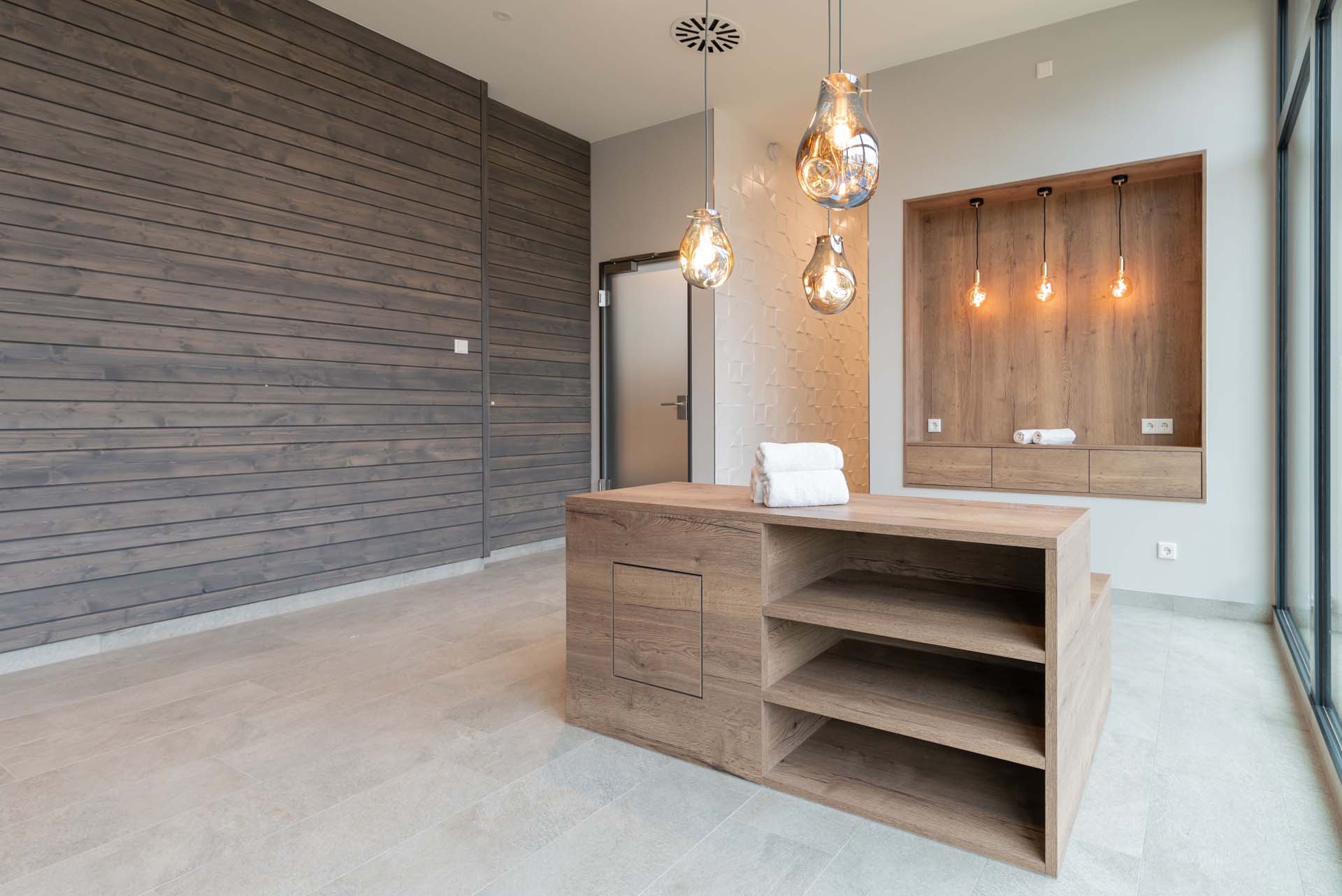 Die Tischlerei Welke hat die Ausstattung des Eingangsbereiches mit Rezeption, Lobby und Kaminlounge, des SPA-Bereiches mit Sauna und Ruhezone sowie des Sonnendecks auf der Dachterrasse nach den Bauplänen der Architekten umgesetzt.
