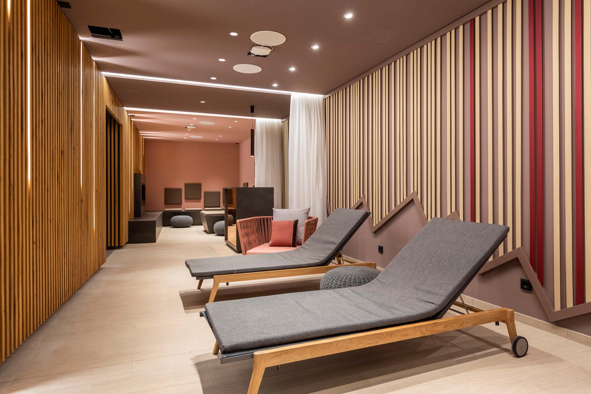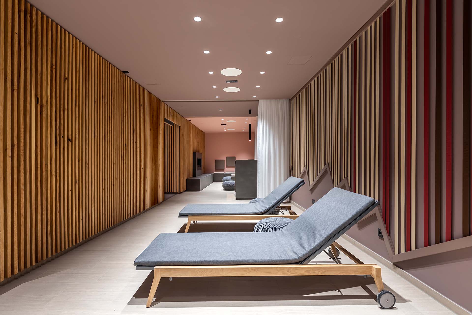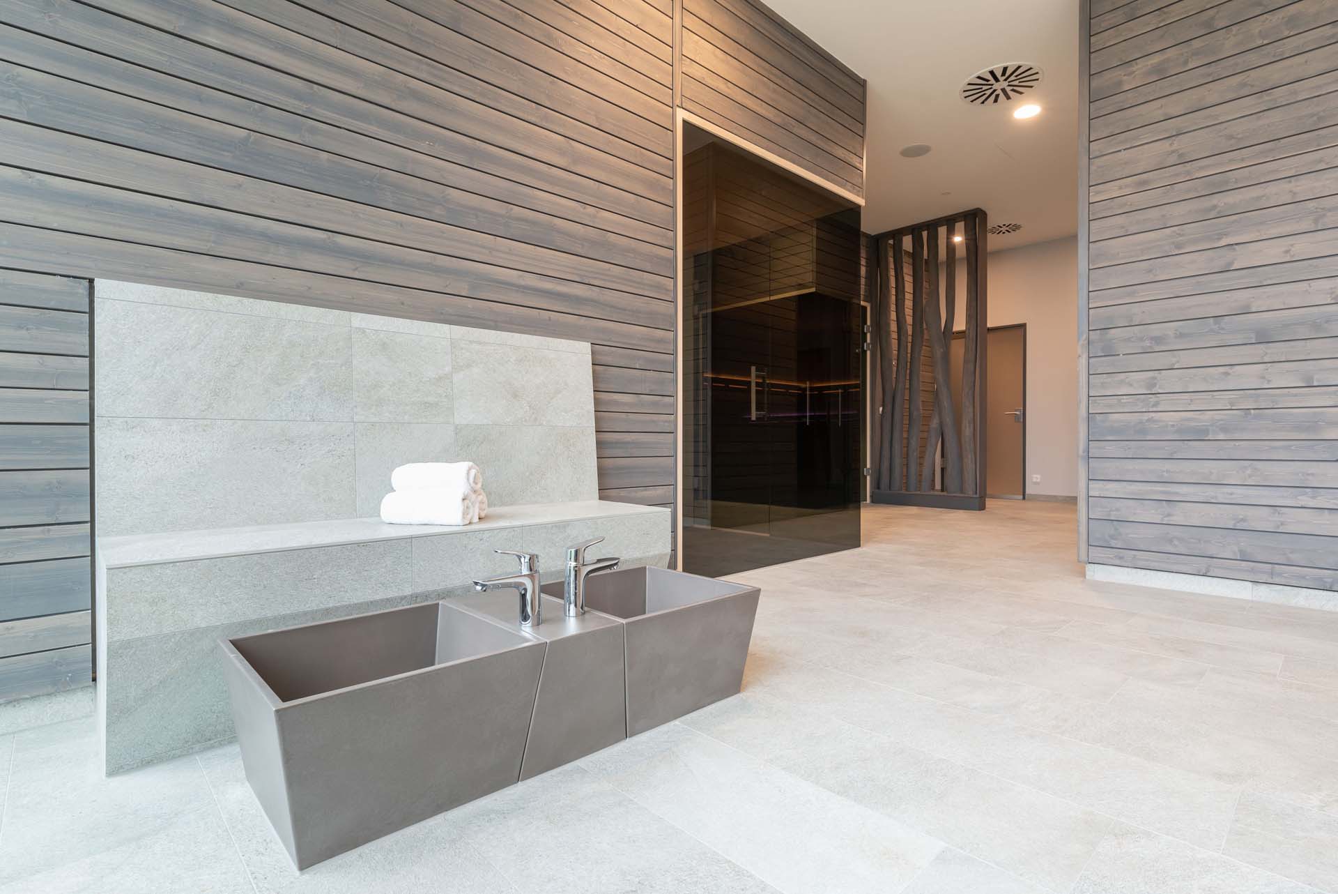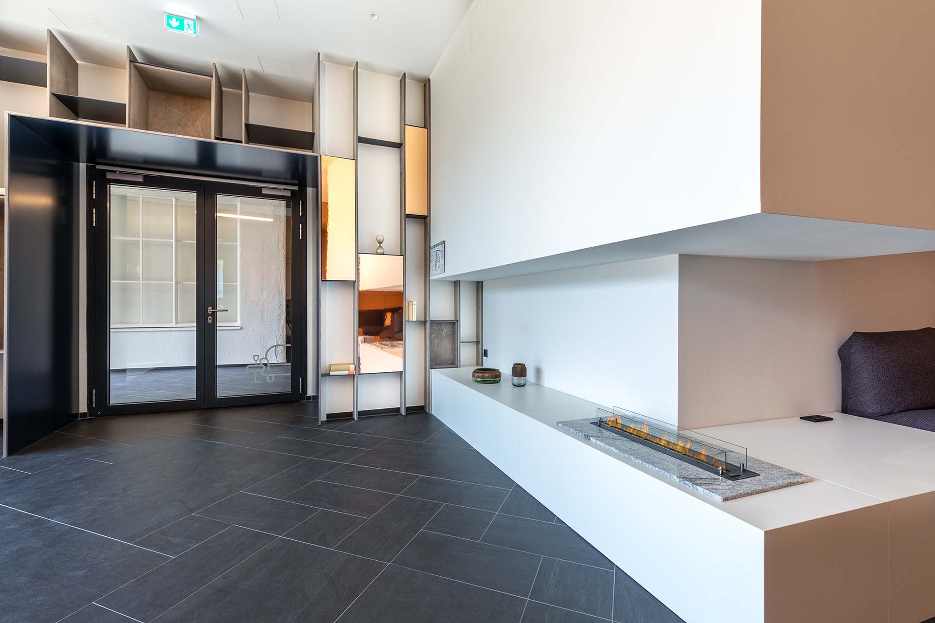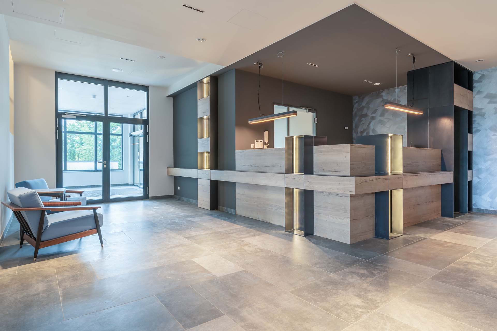 Die Tischlerei Welke hat die Ausstattung des Eingangsbereiches mit Rezeption, Lobby und Kaminlounge, des SPA-Bereiches mit Sauna und Ruhezone sowie des Sonnendecks auf der Dachterrasse nach den Bauplänen der Architekten umgesetzt.